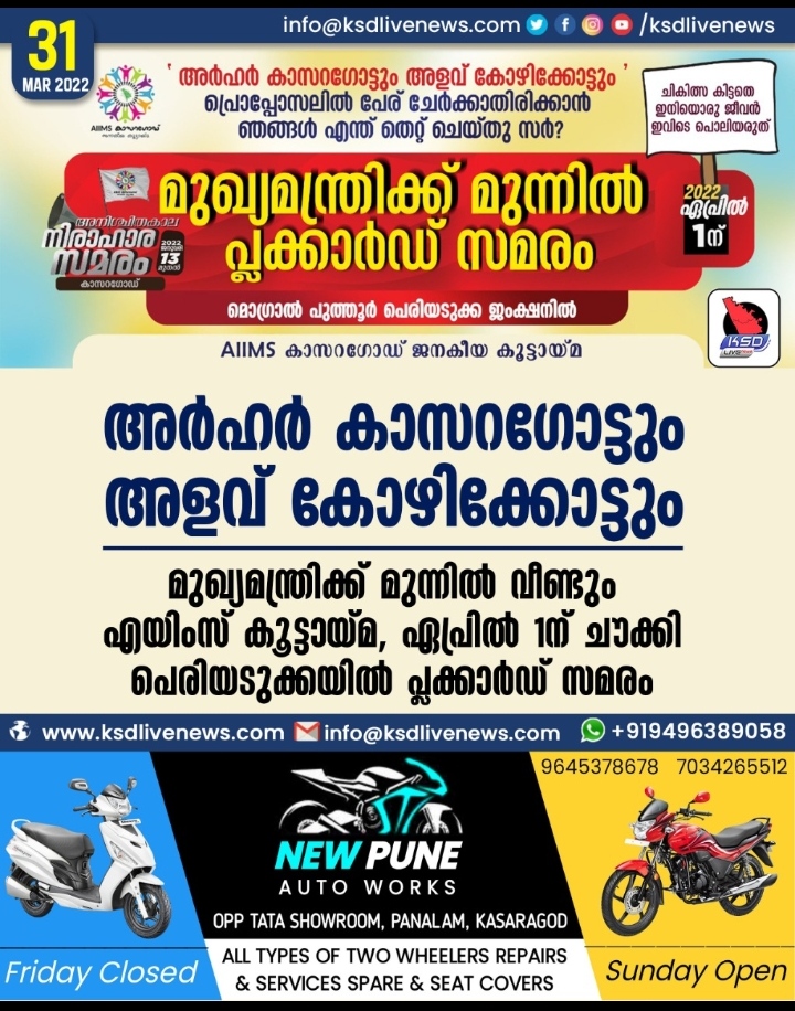 മുഖ്യമന്ത്രിക്ക് മുന്നിൽ വീണ്ടും എയിംസ് കൂട്ടായ്മ. ഏപ്രിൽ 1 ന് ചൗക്കി പെരിയടുക്കയിൽ പ്ലക്കാർഡ് സമരം.