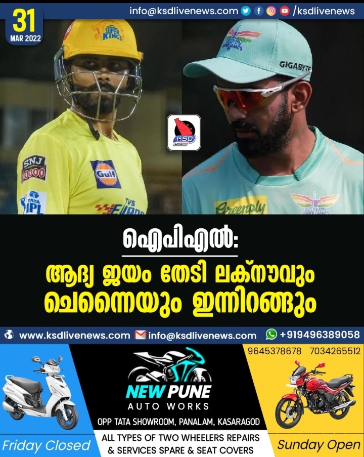 ഐപിഎലില് ആദ്യ ജയം തേടി ലക്നൗ സൂപ്പര് ജയന്്റ്സും ചെന്നൈ സൂപ്പര് കിംഗ്സും ഇന്നിറങ്ങും. ഇരു ടീമുകളും തങ്ങളുടെ ആദ്യ മത്സരത്തില് പരാജയപ്പെട്ടിരുന്നു. ലക്നൗ ഗുജറാത്തിനെതിരെ പരാജയപ്പെട്ടപ്പോള് ഉദ്ഘാടന മത്സരത്തില് കൊല്ക്കത്ത നൈറ്റ് റൈഡേഴ്സിനെതിരെയാണ് ചെന്നൈ പരാജയം രുചിച്ചത്.