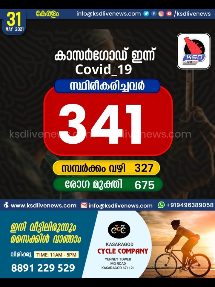 കാസർഗോഡ് ജില്ലയിൽ ഇന്ന് 341 പേർക്ക് കോവിഡ് സ്ഥിരീകരിച്ചു. സമ്പർക്കം വഴി 327 പേർക്കും. 675 പേർക്ക് രോഗമുക്തി