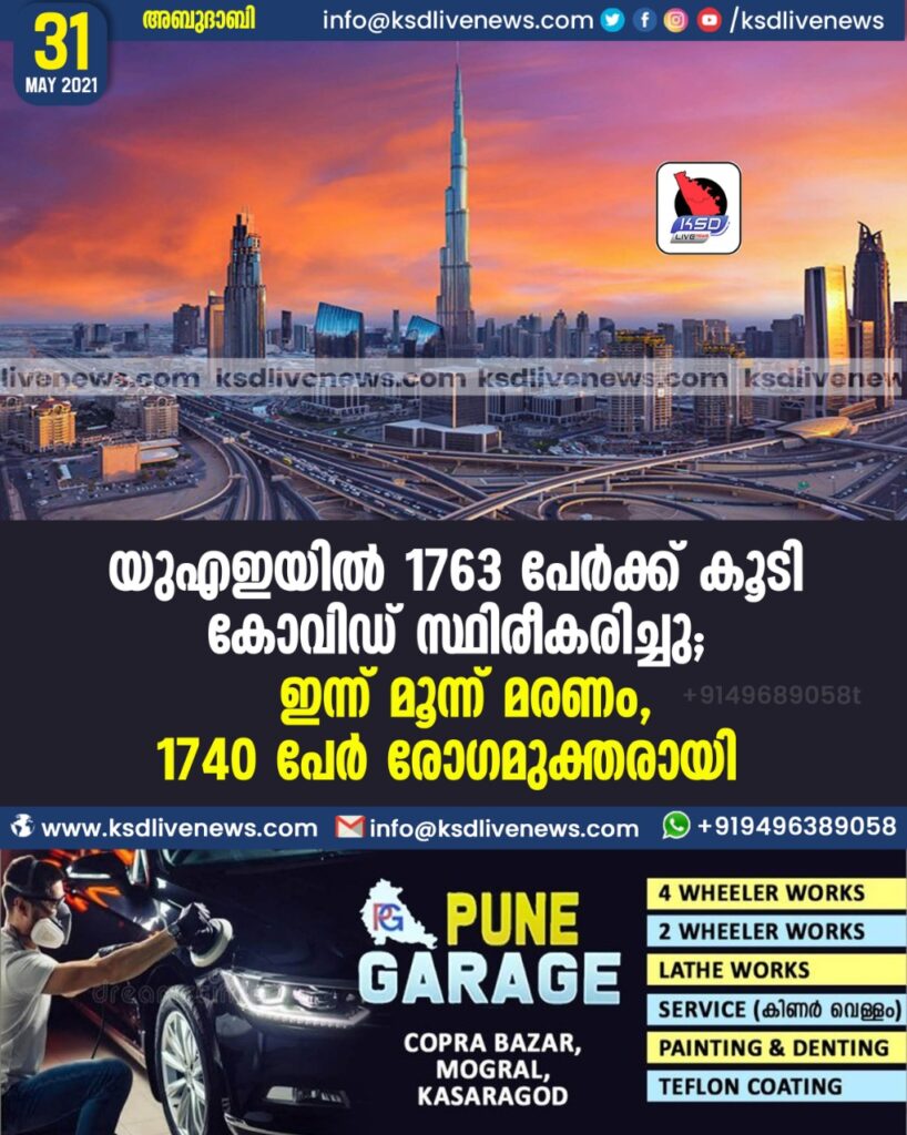 യുഎഇയില് 1763 പേര്ക്ക് കൂടി കോവിഡ് സ്ഥിരീകരിച്ചു; ഇന്ന് മൂന്ന് മരണം, 1740 പേർ രോഗമുക്തരായി