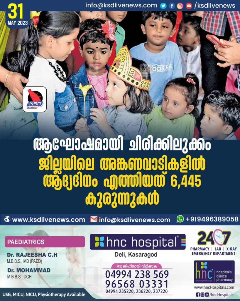 കാസർകോട് ∙ ആടിയും പാടിയും ചിരിച്ചും തുള്ളിച്ചാടിയും കരഞ്ഞു കലങ്ങിയ കണ്ണുമായും ജില്ലയിലെ അങ്കണവാടികളിൽ പ്രവേശനോത്സവത്തിന്റെ ആദ്യദിനത്തിൽ പുതുതായി എത്തിയത് 6445 കുരുന്നുകൾ. കുട്ടികൾക്കു മധുരവും കൈനിറയെ സമ്മാനങ്ങളുമായി വരവേറ്റപ്പോൾ സ്കൂളിലേക്കു പോകുന്ന അങ്കണവാടിയിലെ പൂർവിദ്യാർഥികൾക്കു സമ്മാനപ്പൊതിയും നൽകിയാണ് യാത്രയയപ്പ് നൽകിയത്. ജനപ്രതിനിധികൾ, സന്നദ്ധ സംഘടന പ്രവർത്തകർ, അങ്കണവാടി വികസന സമിതി അംഗങ്ങൾ, രക്ഷിതാക്കൾ, വനിതാ–ശിശുവികസന സമതി ഉദ്യോഗസ്ഥർ, അങ്കണവാടി ജീവനക്കാർ ഉൾപ്പെടെയുള്ളവർ പരിപാടികളിൽ പങ്കാളികളായി. ജില്ലയിൽ 1348 അങ്കണവാടികളാണുള്ളത്. അങ്കണവാടിയിൽ ‘ഇന്നെന്റെ ആദ്യ ദിനം’ എന്ന് എഴുതിയ പ്ലക്കാർഡുകളുമായിട്ടാണു കുട്ടികളെത്തിയത്. പുത്തനുടുപ്പും ബാഗും കുടകളുമായി രക്ഷിതാക്കളുടെ കൂടെ എത്തിയ പൊന്നോമനകളെ ആകർഷിക്കാൻ പല നിറങ്ങളിലുള്ള ബലൂണുകളും തോരണങ്ങളും കെട്ടി അങ്കണവാടികൾ അലങ്കരിച്ചിരുന്നു. കൂടാതെ പല തരത്തിലുള്ള പക്ഷികളും മൃഗങ്ങളും ചിത്രങ്ങളായി ഭിത്തികളിൽ നിരന്നു. ജില്ലയിൽ ഐസിഡിഎസിനു കീഴിലും വർണാഭമായ പ്രവേശനോത്സവം നടത്തി. പഞ്ചായത്തുകളിൽ പഞ്ചായത്തു തല പ്രവേശനോത്സവം നടന്നു. കളിയും പാട്ടും കഥപറച്ചിലുമായി ‘ചിരിക്കിലുക്കം’ എന്ന പേരിൽ ഉത്സവഛായയോടെയാണ് ഓരോ അങ്കണവാടികളിലും ഇത്തവണ പ്രവേശനോത്സവം നടത്തിയത്. പ്രവേശനോത്സവത്തിന്റെ ഭാഗമായി വനിതാ ശിശുവികസന വകുപ്പിന്റെ നേതൃത്വത്തിൽ സമൂഹ മാധ്യമങ്ങളിൽ പ്രൊഫൈൽ ചിത്ര പ്രചാരണം തയാറാക്കിയിരുന്നു. പുതിയതായി എത്തിയ കുട്ടികൾക്കായി കളർ പുസ്തകങ്ങൾ, ബോക്സ്, ക്രയോൺസ് എന്നിവയും പലരും സ്പോൺസർ ചെയ്തു. ജില്ലയിൽ ആറായിരത്തോളം കുട്ടികൾ ഇത്തവണ അങ്കണവാടിയിൽ നിന്നും പടിയിറങ്ങി. ഇവർക്കുള്ള സർട്ടിഫിക്കറ്റ് വിതരണവും പ്രവേശനോത്സവത്തിൽ നടത്തി.