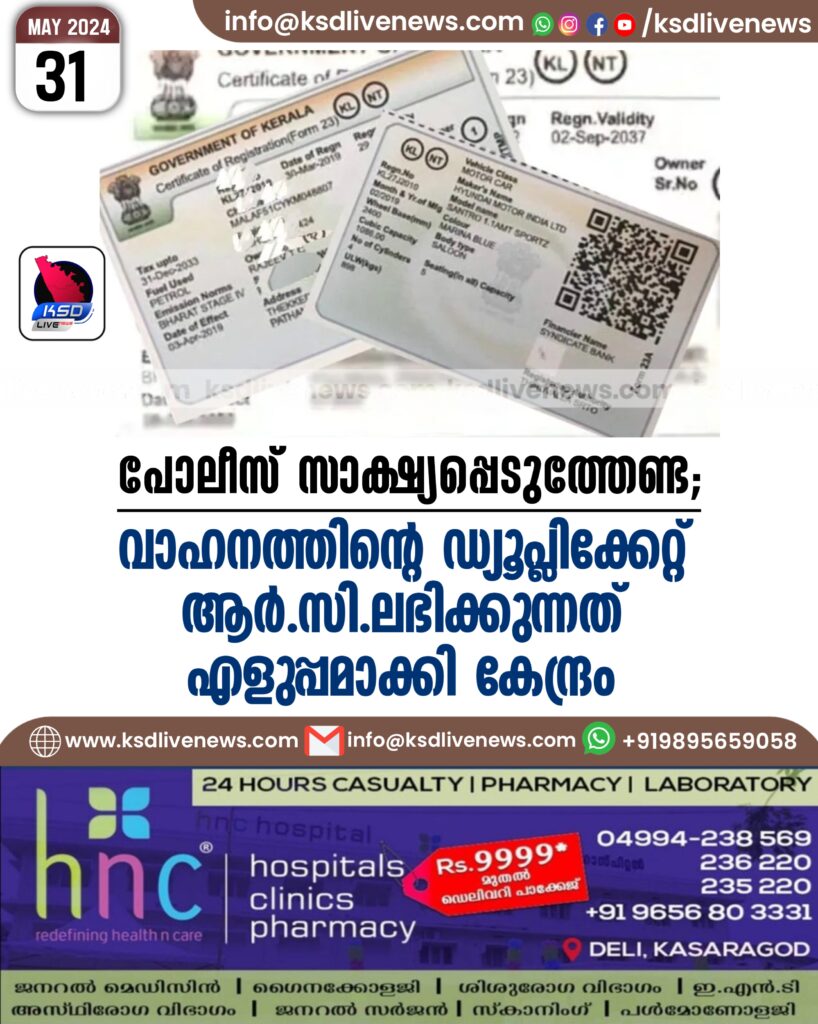 പോലീസ് സാക്ഷ്യപ്പെടുത്തേണ്ട;വാഹനത്തിന്റെ ഡ്യൂപ്ലിക്കേറ്റ് ആര്.സി.ലഭിക്കുന്നത് എളുപ്പമാക്കി കേന്ദ്രം