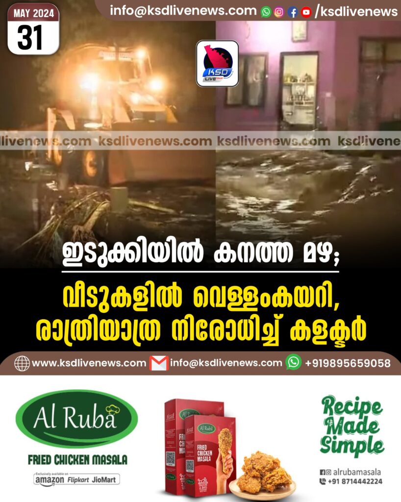 ഇടുക്കിയിൽ കനത്ത മഴ; വീടുകളിൽ വെള്ളംകയറി, രാത്രിയാത്ര നിരോധിച്ച് കളക്ടർ