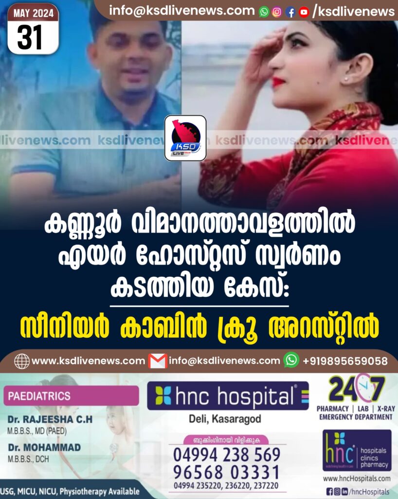 കണ്ണൂർ വിമാനത്താവളത്തിൽ എയര്‍ ഹോസ്റ്റസ് സ്വര്‍ണം കടത്തിയ കേസ്; സീനിയര്‍ കാബിന്‍ ക്രൂ അറസ്റ്റില്‍
