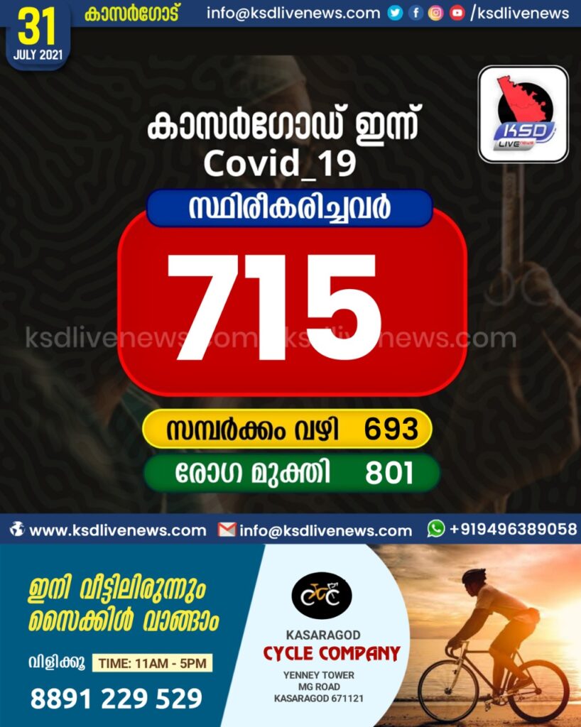 കാസർഗോഡ് ജില്ലയിൽ ഇന്ന് 715 പേർക്ക് കോവിഡ് സ്ഥിരീകരിച്ചു. സമ്പർക്കം വഴി 693 പേർക്കും. 801 പേർക്ക് രോഗമുക്തി