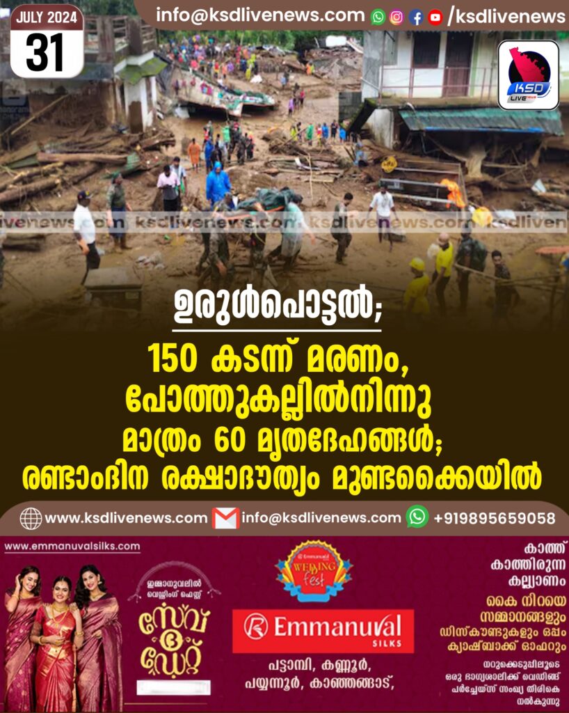 ഉരുൾപൊട്ടൽ; 150 കടന്ന് മരണം, പോത്തുകല്ലില്നിന്നു മാത്രം 60 മൃതദേഹങ്ങള്; രണ്ടാംദിന രക്ഷാദൗത്യം മുണ്ടക്കൈയിൽ