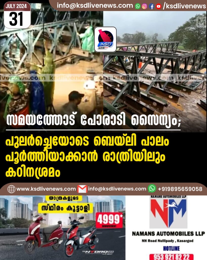 സമയത്തോട് പോരാടി സൈന്യം; പുലർച്ചെയോടെ ബെയ്‌ലി പാലം പൂർത്തിയാക്കാൻ രാത്രിയിലും കഠിനശ്രമം