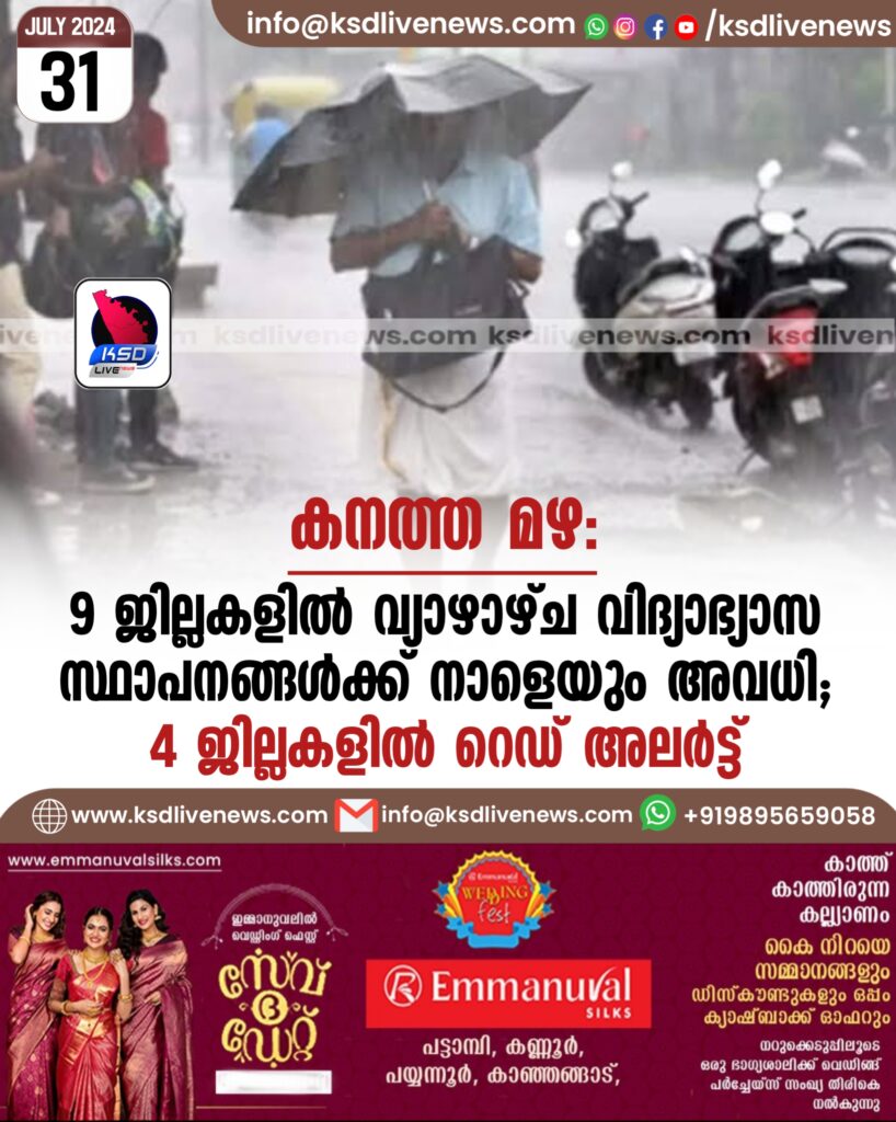 കനത്ത മഴ: 9 ജില്ലകളിൽ വ്യാഴാഴ്ച വിദ്യാഭ്യാസ സ്ഥാപനങ്ങൾക്ക് നാളെയും അവധി; 4 ജില്ലകളിൽ റെഡ് അലർട്ട്