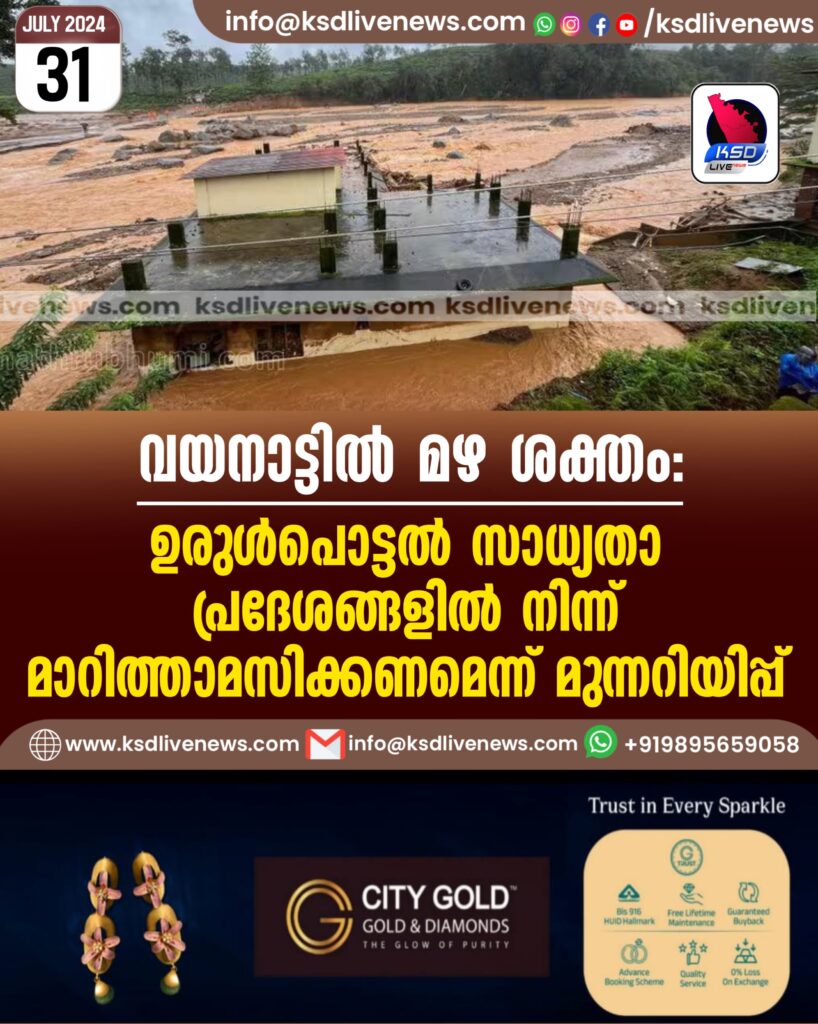 മേപ്പാടി: ജില്ലയിൽ അതിതീവ്ര മഴ പെയ്യുന്ന സാഹചര്യത്തിൽ ഉരുൾപൊട്ടൽ സാധ്യതാ പ്രദേശങ്ങളിലും മുൻ വർഷങ്ങളിൽ ഉരുൾപൊട്ടിയ പ്രദേശങ്ങളിലുമുള്ളവർ ജാഗ്രത പുലർത്തണമെന്ന് വയനാട് ജില്ലാ കളക്ടർ ഡി.ആർ. മേഘശ്രീ അറിയിച്ചു. കുറുമ്പാലക്കോട്ട, ലക്കിടി മണിക്കുന്നു മല, മുട്ടിൽ കോൽപ്പാറ കോളനി,കാപ്പിക്കളo, സുഗന്ധഗിരി, പൊഴുതന പ്രദേശങ്ങളിൽ അതീവ ജാഗ്രത പുലർത്തണം. അപകട ഭീഷണി നിലനിൽക്കുന്നതിനാൽ ക്യാമ്പിലേക്ക് മാറാൻ ആവശ്യപ്പെട്ടിട്ടുള്ളവർ എത്രയും വേഗം താമസസ്ഥലത്തു നിന്നും ക്യാമ്പുകളിലേക്ക് മാറണമെന്നും കളക്ടർ അറിയിച്ചു. തദ്ദേശ സ്ഥാപന സെക്രട്ടറിമാരും വില്ലേജ് ഓഫീസർമാരും വേണ്ട നടപടികൾ സ്വീകരിക്കണമെന്നും ജില്ലാ കളക്ടർ അറിയിച്ചു.