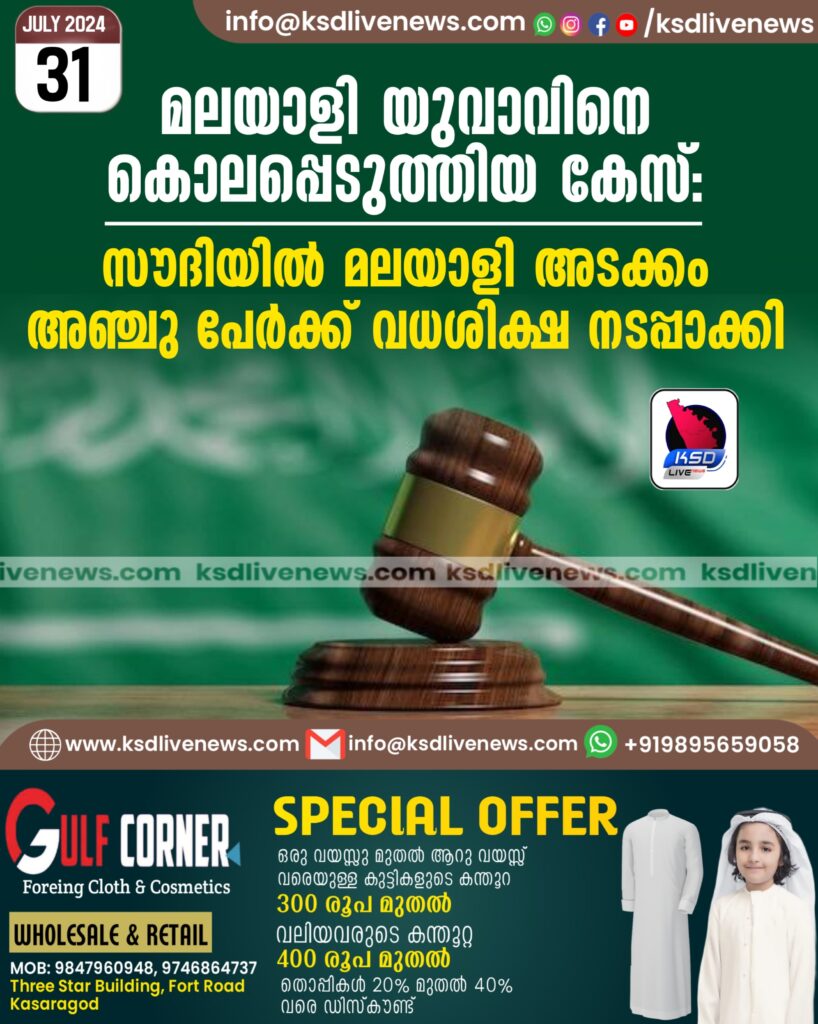 മലയാളി യുവാവിനെ കൊലപ്പെടുത്തിയ കേസ്: സൗദിയിൽ മലയാളി അടക്കം അഞ്ചു പേർക്ക് വധശിക്ഷ നടപ്പാക്കി