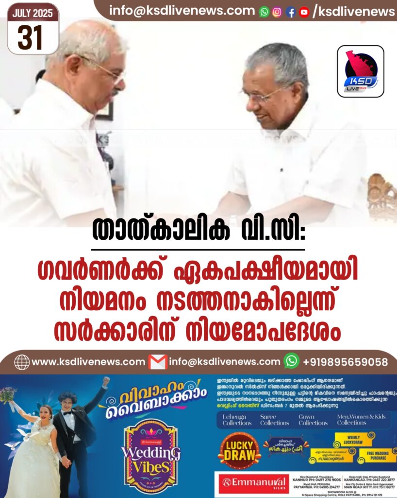 താത്കാലിക വിസി; ഗവർണർക്ക് ഏകപക്ഷീയമായി നിയമനം നടത്തനാകില്ലെന്ന് സർക്കാരിന് നിയമോപദേശം