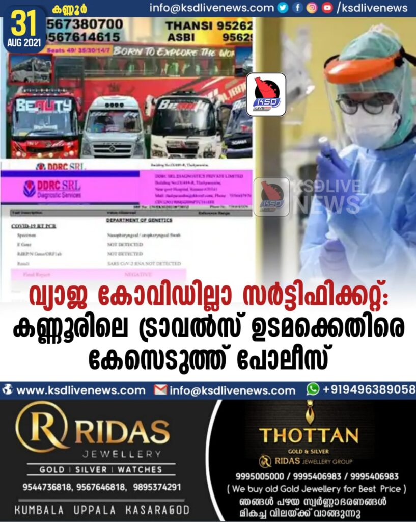 വ്യാജ കോവിഡില്ലാ സർട്ടിഫിക്കറ്റ്: കണ്ണൂരിലെ ട്രാവൽസ് ഉടമക്കെതിരെ കേസെടുത്ത് പോലീസ്