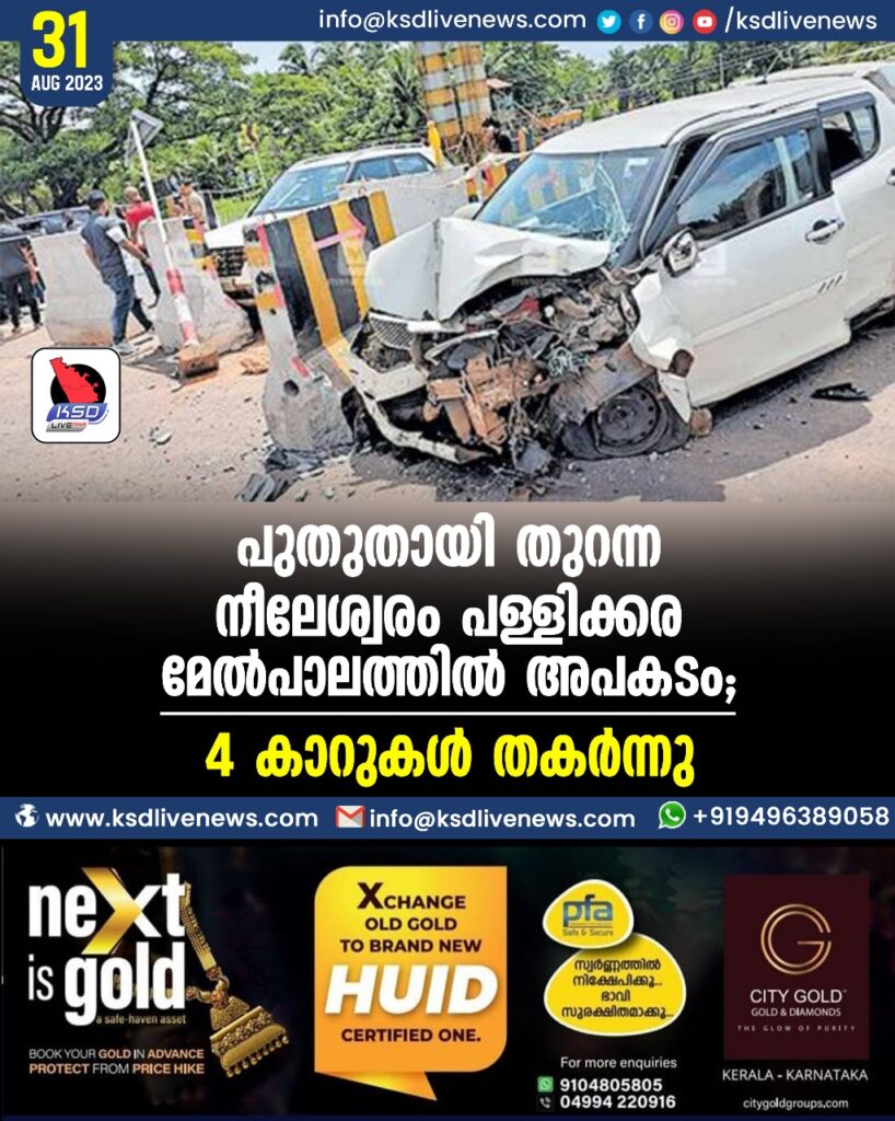പുതുതായി തുറന്ന നീലേശ്വരം പള്ളിക്കര മേൽപാലത്തിൽ അപകടം; 4 കാറുകൾ തകർന്നു