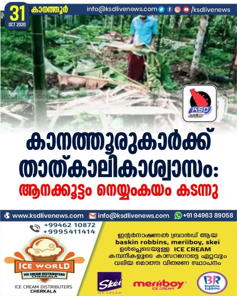 കാനത്തൂർ: ഒടുവിൽ നാട്ടുകാരുടെയും വനപാലകരുടെയും പ്രയത്നം ഫലംകണ്ടു. മുളിയാർ വനത്തിൽനിന്ന് തുരത്തിയ ആനക്കൂട്ടം തിരിച്ചുവരാൻ ശ്രമിച്ചെങ്കിലും നാട്ടുകാർ സമ്മതിച്ചില്ല. തീയിട്ടും പന്തം, ചൂട്ട് എന്നിവ കത്തിച്ചുപിടിച്ചും അവർ ആനകളെ തിരിച്ചയച്ചു. ആനകൾ നെയ്യംകയം കടന്നു. ആനക്കൂട്ടം തകർത്ത സോളാർ വേലി പുനഃസ്ഥാപിച്ചു. കൊട്ടംകുഴി, കർമത്തോടി പ്രദേശങ്ങളിലുള്ള ആനകളെയും പുലിപറമ്പ് കടത്തിവിട്ട് ആനമതിൽ പുനഃസ്ഥാപിച്ചാൽ മാത്രമേ സമാധാനത്തോടെ കിടന്നുറങ്ങാനാവൂ എന്നാണ് കർഷകർ പറയുന്നത്. കാനത്തൂർ: ഒരു നാട് പ്രതിസന്ധി നേരിടുമ്പോൾ സമൂഹിക മാധ്യമങ്ങളെ ഏറ്റവും മികച്ചരീതിയിൽ ഉപയോഗിച്ച് എങ്ങനെ അതിജീവിക്കാമെന്ന് കാട്ടിത്തരികയാണ് കാനത്തൂരുകാർ. ഒരു മാസമായി തുടരുന്ന കാട്ടാന ശല്യത്തിന്റെ പശ്ചാത്തലത്തിൽ അവർ ‘ആനക്കാര്യം’ എന്ന വാട്ട്സാപ്പ് കൂട്ടായ്മയ്ക്ക് രൂപംനൽകി. പ്രദേശത്തുള്ള എല്ലാ കർഷകരെയും ഒരു കുടക്കീഴിൽ കൊണ്ടുവന്നു.