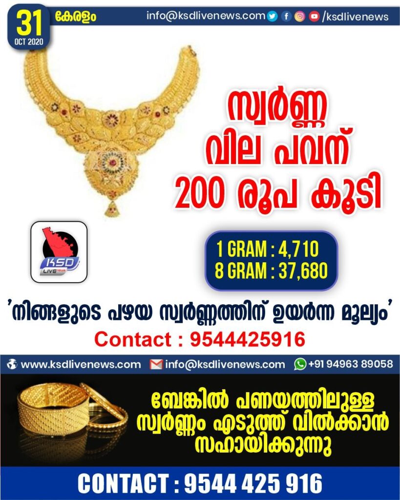 സ്വർണ്ണ വില പന് 200 രൂപ കൂടിSHARE THIS ONകാസര്ഗോഡ് : സ്വര്ണ്ണ വിലയിൽ ചാഞ്ചാട്ടം തുടരുന്നു, ഇന്നത്തെ വില പവന്200 രൂപ കൂടി. ഗ്രാമിന് 4710 രൂപയും പവന് 37680 രൂപയുമാണ്.