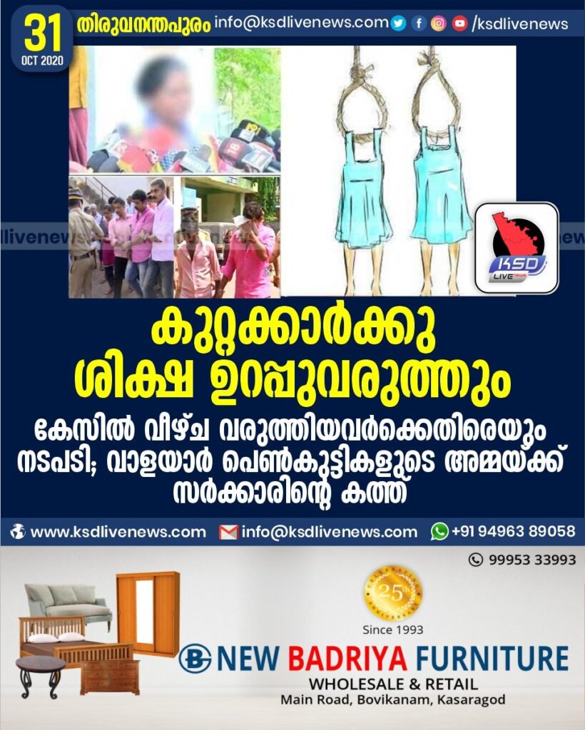 കുറ്റക്കാർക്കു ശിക്ഷ ഉറപ്പുവരുത്തും , കേസിൽ വീഴ്ച വരുത്തിയവർക്കെതിരെയും നടപടി ; വാളയാർ പെൺകുട്ടികളുടെ അമ്മയ്ക്ക് സർക്കാരിന്റെ കത്ത്