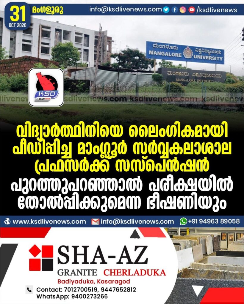 വിദ്യാര്‍ത്ഥിനിയെ ലൈംഗികമായി പീഡിപ്പിച്ച മാംഗ്ലൂർ സർവ്വകലാശാല പ്രഫസർക്ക് സസ്പെൻഷൻ ; പുറത്തുപറഞ്ഞാല്‍ പരീക്ഷയില്‍ തോല്‍പ്പിക്കുമെന്ന ഭീഷണിയും