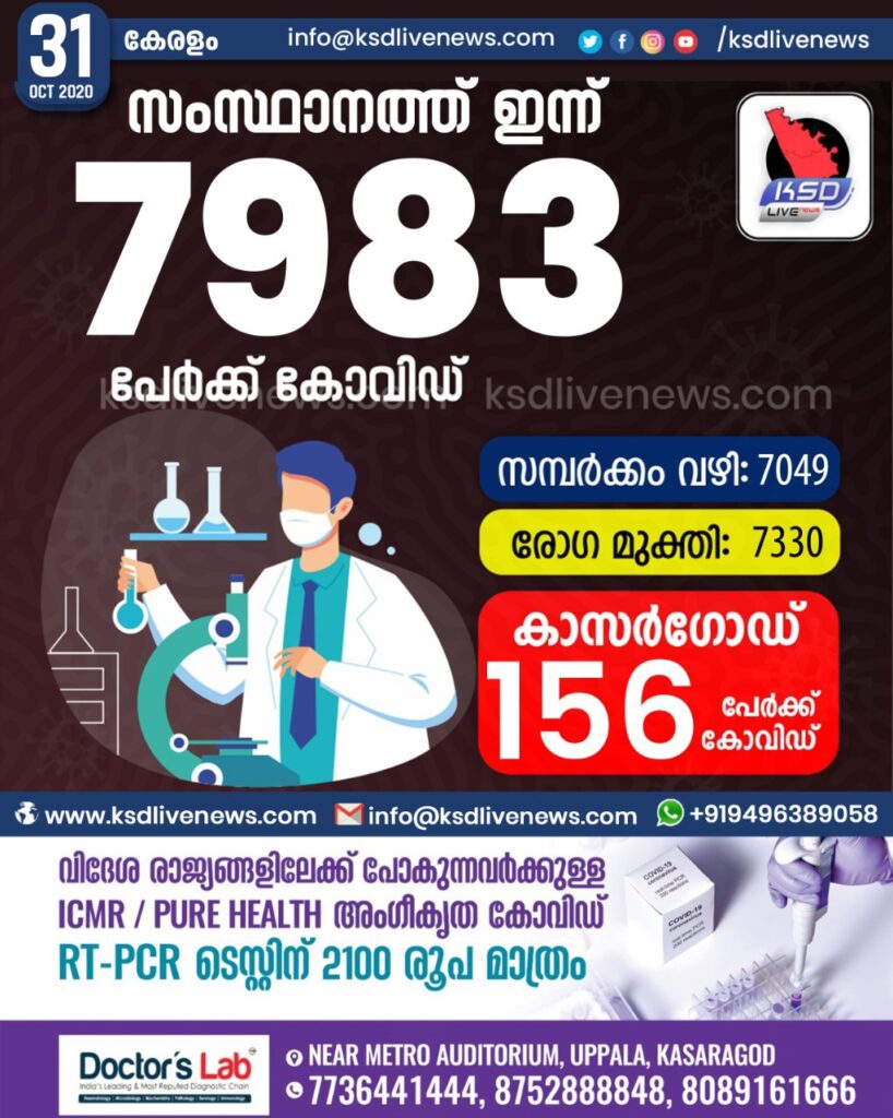 സംസ്ഥാനത്ത് ഇന്ന് 7983 പേർക്ക് കോവിഡ് സ്ഥിരീകരിച്ചു. സമ്പർക്കം വഴി 7049 പേർക്കും ; 7330 പേർക്ക് രോഗ മുക്തിയും ; കാസർഗോഡ് ജില്ലയിൽ 156 പേർക്ക് കോവിഡ് ; മരണം 27
