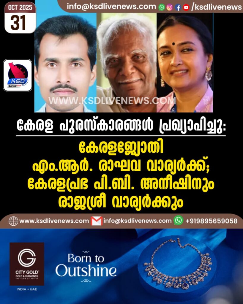 കേരള പുരസ്കാരങ്ങൾ പ്രഖ്യാപിച്ചു: കേരളജ്യോതി എം.ആര്. രാഘവ വാര്യര്ക്ക്; കേരളപ്രഭ പി.ബി. അനീഷിനും രാജശ്രീ വാര്യര്ക്കും