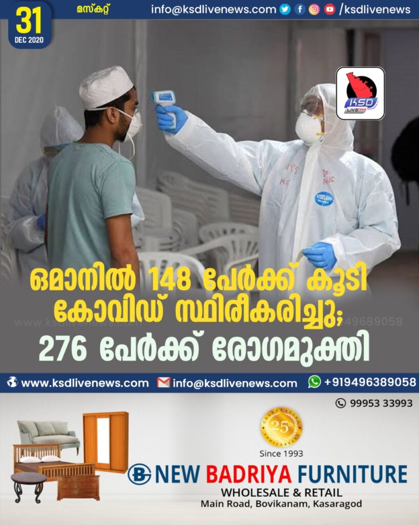 ഒമാനിൽ 148 പേർക്ക് കൂടി കോവിഡ് സ്ഥിരീകരിച്ചു 276 പേര്ക്ക് കൂടി രോഗമുക്തി