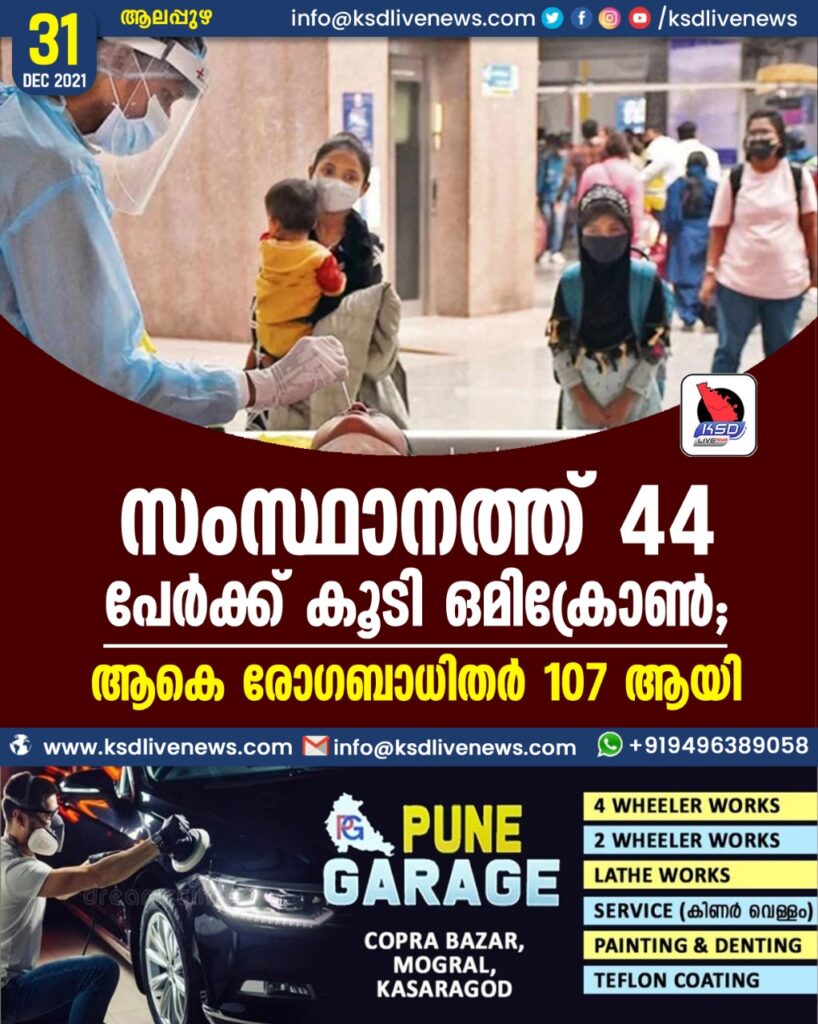 സംസ്ഥാനത്ത് 44 പേര്‍ക്ക് കൂടി ഒമിക്രോണ്‍; ആകെ രോഗബാധിതര്‍ 107 ആയി