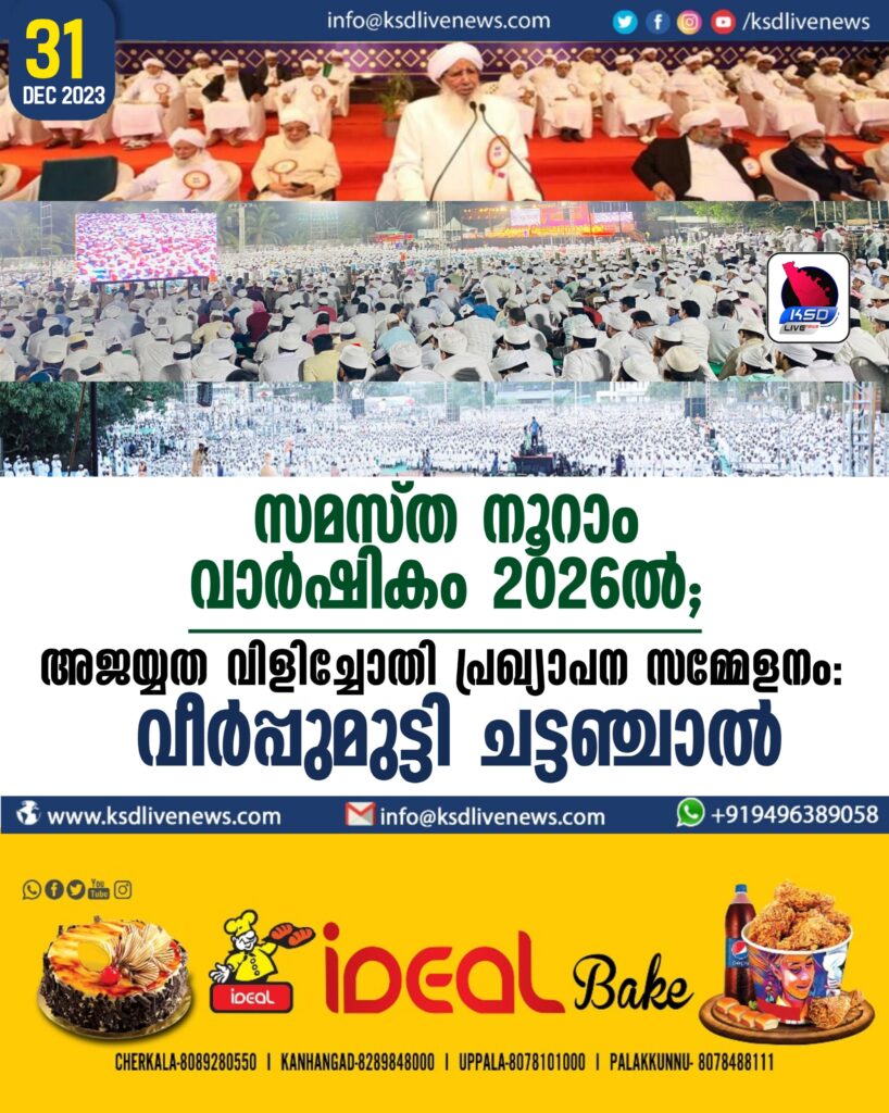 സമസ്ത നൂറാം വാർഷികം 2026ൽ; അജയ്യത വിളിച്ചോതി പ്രഖ്യാപന സമ്മേളനം: വീർപ്പുമുട്ടി ചട്ടഞ്ചാൽ