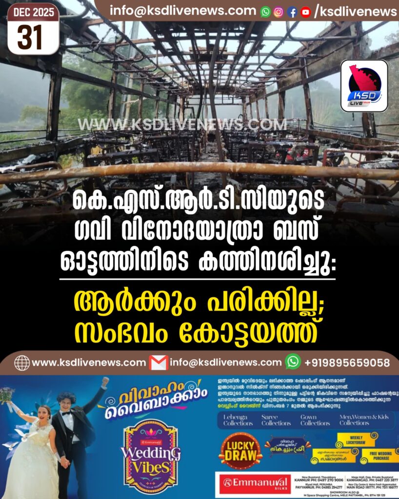 കെ.എസ്.ആർ.ടി.സിയുടെ ഗവി വിനോദയാത്രാ ബസ് ഓട്ടത്തിനിടെ കത്തിനശിച്ചു: ആർക്കും പരിക്കില്ല; സംഭവം കോട്ടയത്ത്