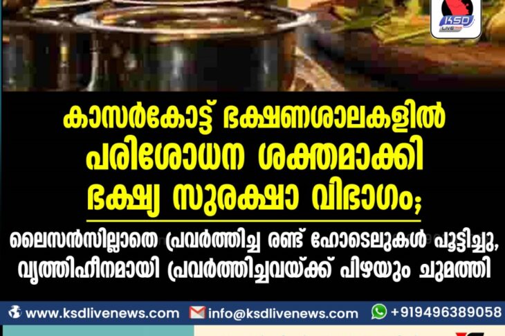 ആരോഗ്യംകാസർഗോഡ് കാസർകോട്ട് ഭക്ഷണശാലകളിൽ പരിശോധന ശക്തമാക്കി ഭക്ഷ്യ സുരക്ഷാ വിഭാഗം; ലൈസൻസില്ലാതെ പ്രവർത്തിച്ച രണ്ട് ഹോടെലുകൾ പൂട്ടിച്ചു, വൃത്തിഹീനമായി പ്രവർത്തിച്ചവയ്ക്ക് പിഴയും ചുമത്തിMay 12, 2022