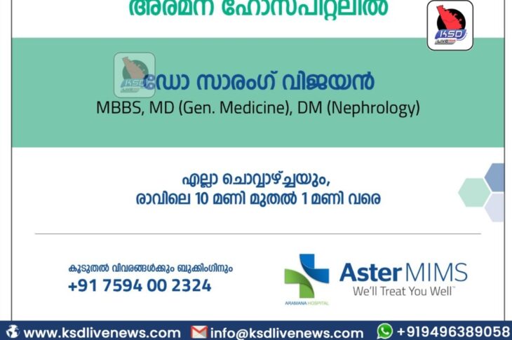 ആരോഗ്യംകാസർഗോഡ് മുഖത്തും കാലിലും വയറിലും കാണുന്ന നീര് #വിശപ്പില്ലായ്മ,ക്ഷീണം,കിതപ്പ്,വിളർച്ച #നട്ടെല്ലിൻ്റെ അടിഭാഗത്ത് വേദന, #ചൊറിച്ചിൽ ,ശരീര വേദന #മൂത്രത്തിൻ്റെ അളവിലുള്ള കുറവ്,മൂത്രത്തിൽ രക്തമോ പഴുപ്പോ #മൂത്രം പോകാനുള്ള തടസം അമിതമായി പതഞ്ഞു പോകുക #അനിയന്ത്രിതമായ രക്താതിസമ്മർദ്ദം # പ്രമേഹം,മൂത്രത്തിൽ കല്ല് #മൂത്രാശയ സംബന്ധമായ രോഗങ്ങൾ നെഫ്രോടിക് സിൻഡ്രം തുടങ്ങിയത് കിഡ്നി സംബന്ധമായ രോഗങ്ങൾക്ക് രോഗ ലക്ഷണങ്ങൾക്കും ആസ്റ്റർ മിംസ് കണ്ണൂരിലെ പ്രശസ്ത നെഫ്രോളജിസ്റ്റ് (കിഡ്നി) ഡോകടർ സാരംഗ് വിജയൻ്റെ സേവനം 20/04/2021 എല്ലാ ചൊവ്വാഴ്ചകളിലും രാവിലെ 10 മണി മുതൽ 1 മണി വരെ ഉണ്ടായിരിക്കുന്നതാണ്.April 16, 2021
