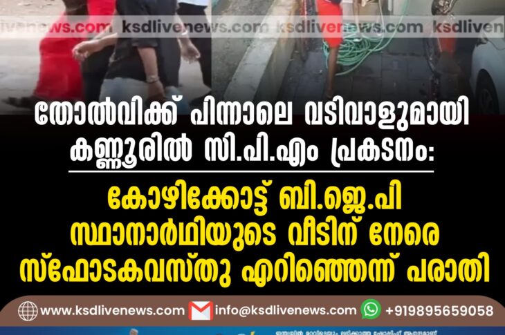 കണ്ണൂർ തോൽവിക്ക് പിന്നാലെ വടിവാളുമായി കണ്ണൂരിൽ സി.പി.എം പ്രകടനം: കോഴിക്കോട്ട് ബി.ജെ.പി സ്ഥാനാർഥിയുടെ വീടിന് നേരെ സ്ഫോടകവസ്തു എറിഞ്ഞെന്ന് പരാതിDecember 13, 2025