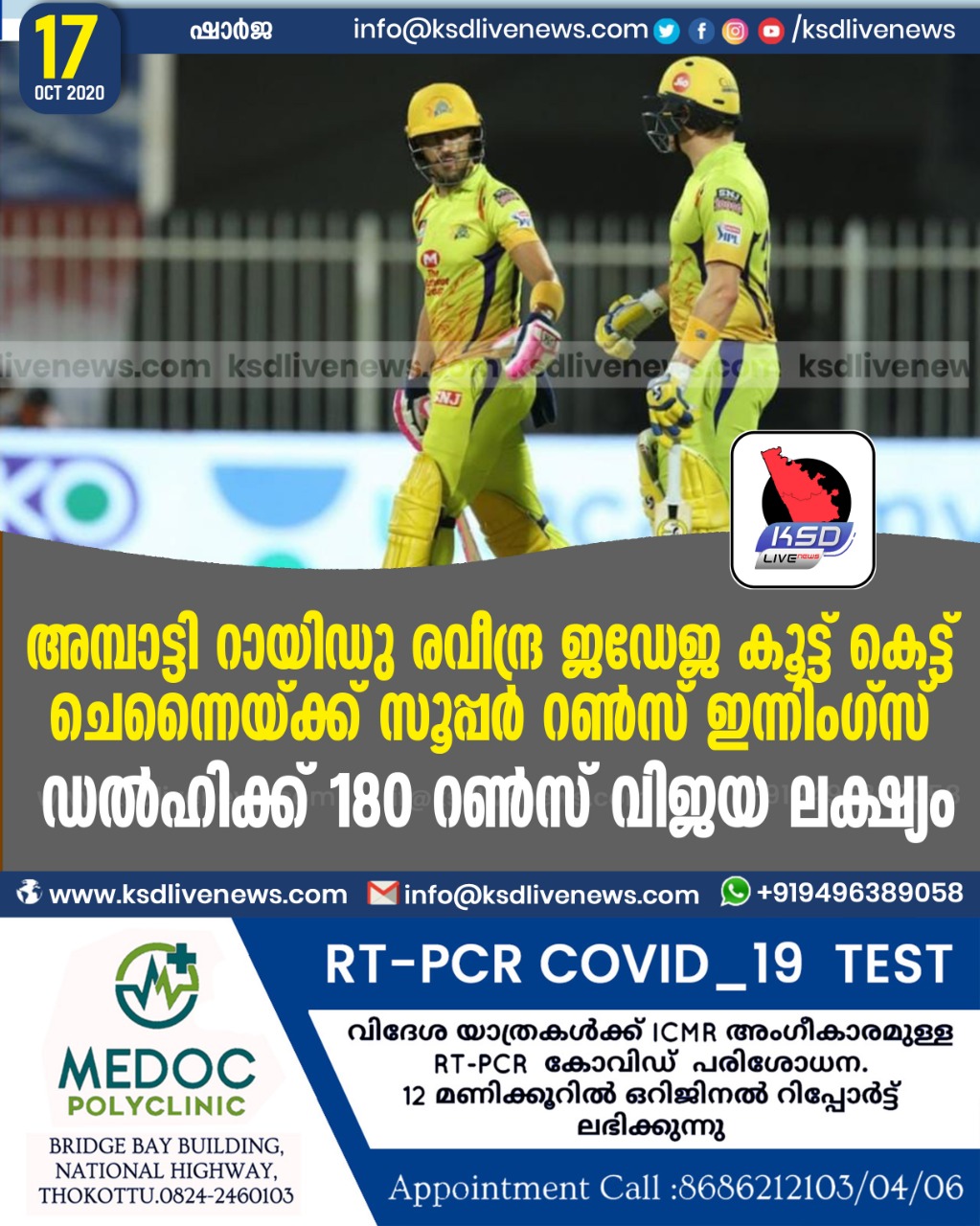 കായികം അമ്പാട്ടി റായിഡു രവീന്ദ്ര ജഡേജ കൂട്ട് കെട്ട് ചെന്നൈക്ക് സൂപ്പർ റൺസ് ഇന്നിംഗ്സ്ഡൽഹിക്ക് 180 റൺസ് വിജയ ലക്ഷ്യംOctober 17, 2020