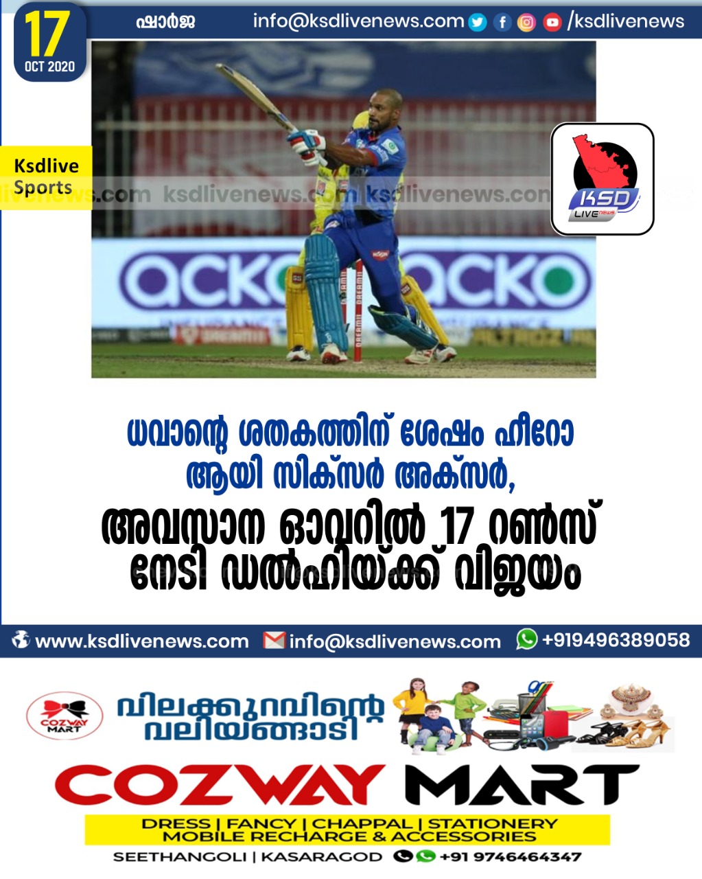 കായികം ധവാന്റെ ശതകത്തിന് ശേഷം ഹീറോ ആയി സിക്സര് അക്സര്, അവസാന ഓവറില് 17 റണ്സ് നേടി ഡല്ഹിയ്ക്ക് വിജയംOctober 17, 2020