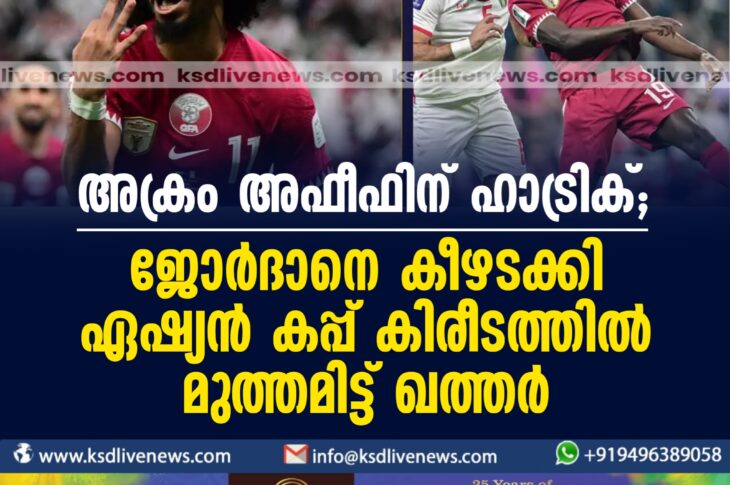 കായികം അക്രം അഫീഫിന് ഹാട്രിക്; ജോർദാനെ കീഴടക്കി ഏഷ്യൻ കപ്പ് കിരീടത്തിൽ മുത്തമിട്ട് ഖത്തർFebruary 10, 2024