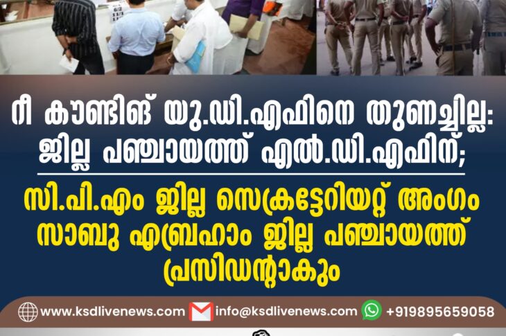 കാസർഗോഡ് റീ കൗണ്ടിങ് യു.ഡി.എഫിനെ തുണച്ചില്ല: ജില്ല പഞ്ചായത്ത് എൽ.ഡി.എഫിന്; സി.പി.എം ജില്ല സെക്രട്ടേറിയറ്റ് അംഗം സാബു എബ്രഹാം ജില്ല പഞ്ചായത്ത് പ്രസിഡന്റാകുംDecember 15, 2025
