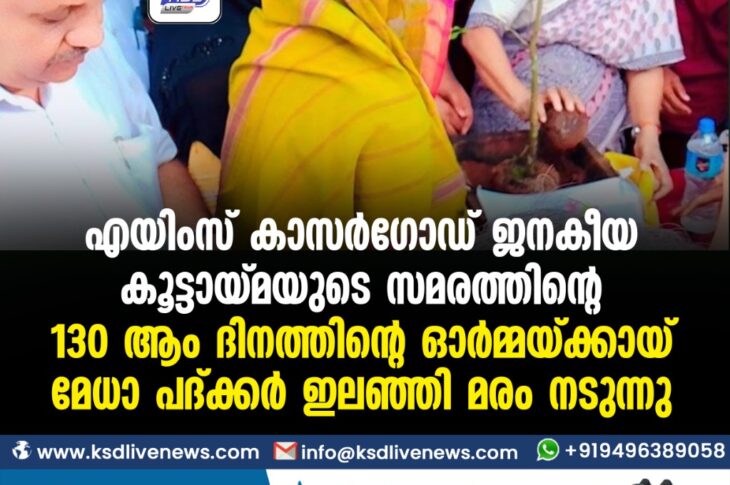 കാസർഗോഡ് എയിംസ് കാസർഗോഡ് ജനകീയ കൂട്ടായ്മയുടെ സമരത്തിന്റെ 130 ആം ദിനത്തിന്റെ ഓർമ്മയ്ക്കായ് മേധാ പദ്ക്കർ ഇലഞ്ഞി മരം നടുന്നു.May 23, 2022