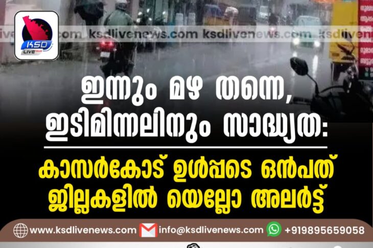 കേരളം ഇന്നും മഴ തന്നെ, ഇടിമിന്നലിനും സാദ്ധ്യത: കാസർകോട് ഉൾപ്പടെ ഒൻപത് ജില്ലകളില് യെല്ലോ അലര്ട്ട്October 23, 2025