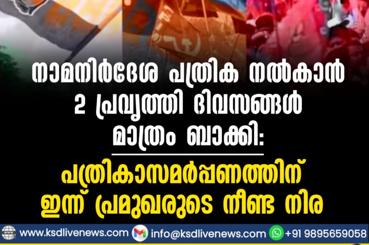 കേരളം നാമനിർദേശ പത്രിക നൽകാൻ 2 പ്രവൃത്തി ദിവസങ്ങൾ മാത്രം ബാക്കി: പത്രികാസമർപ്പണത്തിന് ഇന്ന് പ്രമുഖരുടെ നീണ്ട നിരMarch 21, 2026