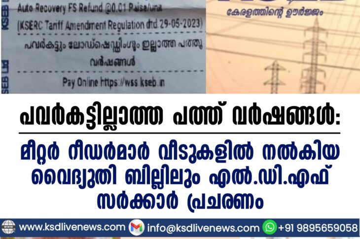 കേരളം പവർകട്ടില്ലാത്ത പത്ത് വർഷങ്ങൾ: മീറ്റർ റീഡർമാർ വീടുകളിൽ നൽകിയ വൈദ്യുതി ബില്ലിലും എൽ.ഡി.എഫ് സർക്കാർ പ്രചരണംMarch 21, 2026