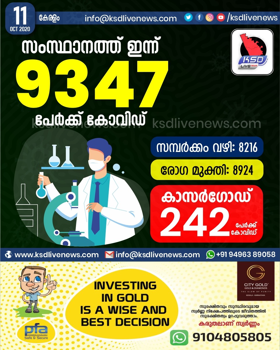 കേരളം കോവിഡിൽ വിറച്ച് കേരളം ; സംസ്ഥാനത്ത് ഇന്ന് 9347 പേർക്ക് കോവിഡ് സ്ഥിരീകരിച്ചു. സമ്പർക്കം വഴി 8216 പേർക്കും.രോഗ മുക്തി 8924 പേർക്കും. കാസർഗോഡ് ജില്ലയിൽ ഇന്ന് 242 പേർക്ക് കോവിഡ് സ്ഥിരീകരിച്ചു. മരണം 25October 11, 2020