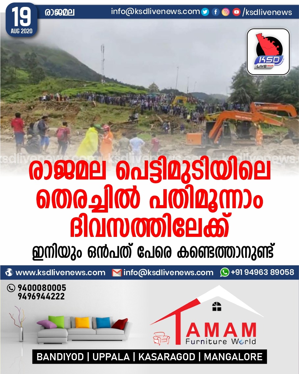 കേരളം രാജമല പെട്ടിമുടിയിലെ തെരച്ചിൽ പതിമൂന്നാം ദിവസത്തിലേക്ക്ഇനിയും ഒൻപത് പേരെ കണ്ടെത്താനുണ്ട്August 19, 2020