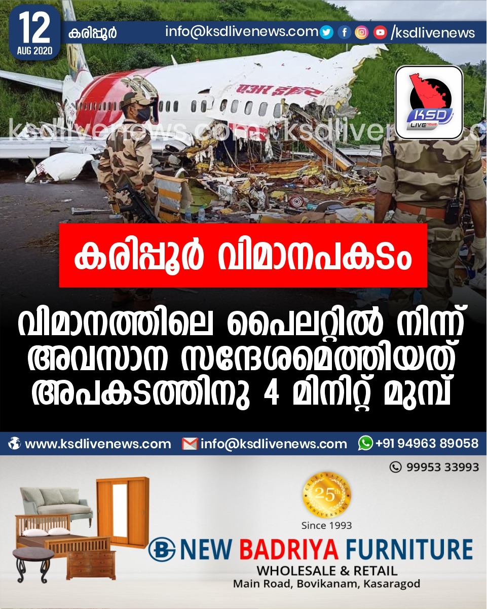 കേരളം കരിപ്പൂർ വിമാനപകടം: വിമാനത്തിലെ പൈലറ്റിൽ നിന്ന് അവസാന സന്ദേശമെത്തിയത് അപകടത്തിനു 4 മിനിറ്റ് മുമ്പ്August 12, 2020