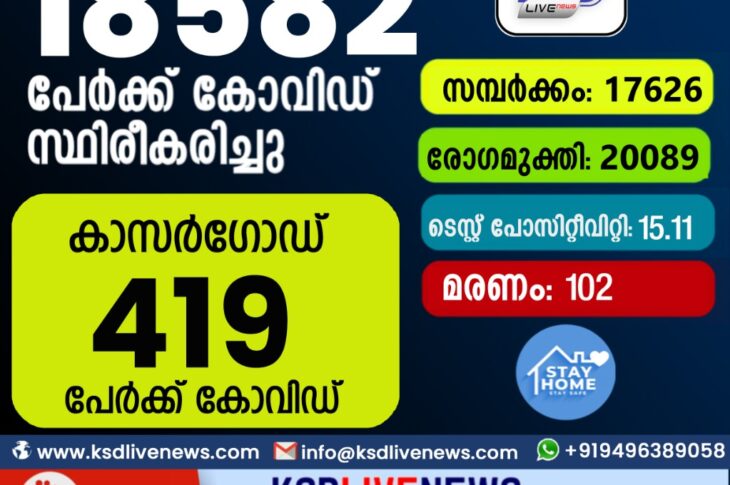 കേരളംകോവിഡ് 19 സംസ്ഥാനത്ത് ഇന്ന് 18582 പേർക്ക് കോവിഡ് സ്ഥിരീകരിച്ചു. സമ്പർക്കം വഴി 17626 പേർക്കും ; ആശ്വാസമായി 20089 പേർക്ക് രോഗ മുക്തിയും ; കാസർഗോഡ് ജില്ലയിൽ 419 പേർക്ക് പുതിയ കോവിഡ് കേസുകൾ ; മരണം 102August 15, 2021