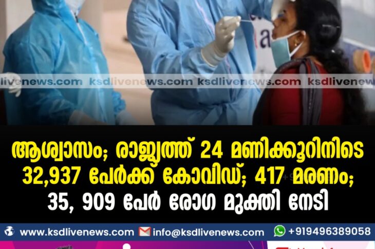 കോവിഡ് 19ദേശീയം ആശ്വാസം ; രാജ്യത്ത് 24 മണിക്കൂറിനിടെ 32,937 പേർക്ക് കോവിഡ്; 417 മരണം; 35, 909 പേർ രോഗ മുക്തി നേടിAugust 16, 2021