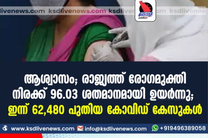 കോവിഡ് 19ദേശീയം ആശ്വാസം ; രാജ്യത്ത് രോഗമുക്തി നിരക്ക് 96.03 ശതമാനമായി ഉയർന്നു; ഇന്ന് 62,480 പുതിയ കോവിഡ് കേസുകൾJune 18, 2021