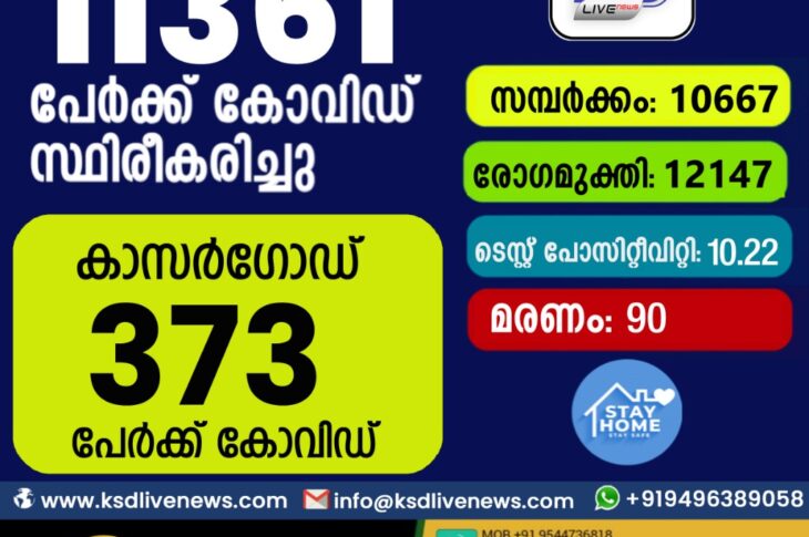 കേരളംകോവിഡ് 19 സംസ്ഥാനത്ത് ഇന്ന് 11361 പേർക്ക് കോവിഡ് സ്ഥിരീകരിച്ചു. സമ്പർക്കം വഴി 10667 പേർക്കും ; ആശ്വാസമായി 12147 പേർക്ക് രോഗ മുക്തിയും ; കാസർഗോഡ് ജില്ലയിൽ 373 പേർക്ക് പുതിയ കോവിഡ് കേസുകൾ ; മരണം 90June 18, 2021
