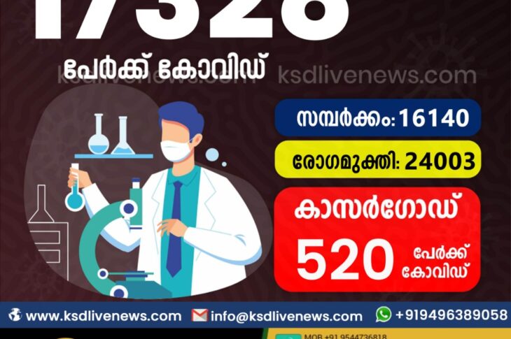 സംസ്ഥാനത്ത് ഇന്ന് 17328 പേർക്ക് കോവിഡ് സ്ഥിരീകരിച്ചു. സമ്പർക്കം വഴി 16140 പേർക്കും ; ആശ്വാസമായി 24003 പേർക്ക് രോഗ മുക്തിയും ; കാസർഗോഡ് ജില്ലയിൽ 520 പേർക്ക് പുതിയ കോവിഡ് കേസുകൾ ; മരണം 209