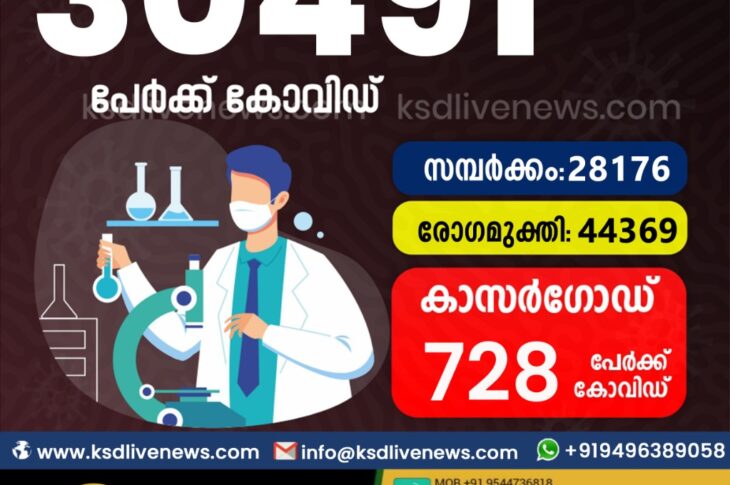 സംസ്ഥാനത്ത് ഇന്ന് 30,491 പേർക്ക് കോവിഡ് സ്ഥിരീകരിച്ചു. സമ്പർക്കം വഴി 28176 പേർക്കും ; ആശ്വാസമായി 44369 പേർക്ക് രോഗ മുക്തിയും ; കാസർഗോഡ് ജില്ലയിൽ 728 പേർക്ക് പുതിയ കോവിഡ് കേസുകൾ ; മരണം 128