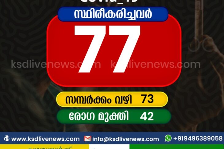 കാസർഗോഡ്കോവിഡ് 19 കാസർഗോഡ് ജില്ലയിൽ ഇന്ന് 77 പേർക്ക് കോവിഡ് സ്ഥിരീകരിച്ചു. സമ്പർക്കം വഴി 73 പേർക്കും. 42 പേർക്ക് രോഗമുക്തിJanuary 6, 2021