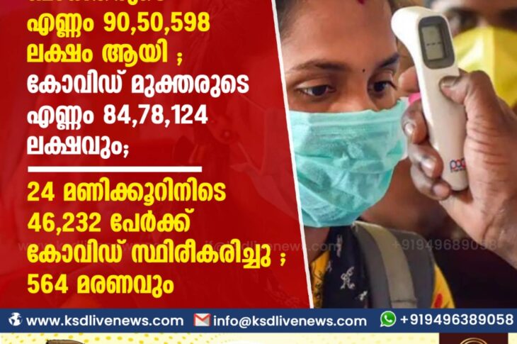 കോവിഡ് 19ദേശീയം രാജ്യത്തെ കോവിഡ് ബാധിതരുടെ എണ്ണം 90,50,598 ലക്ഷം ആയി ; കോവിഡ് മുക്തരുടെ എണ്ണം 84,78,124 ലക്ഷവും ;24 മണിക്കൂറിനിടെ 46,232 പേർക്ക് കോവിഡ് സ്ഥിരീകരിച്ചു ; 564 മരണവുംNovember 21, 2020