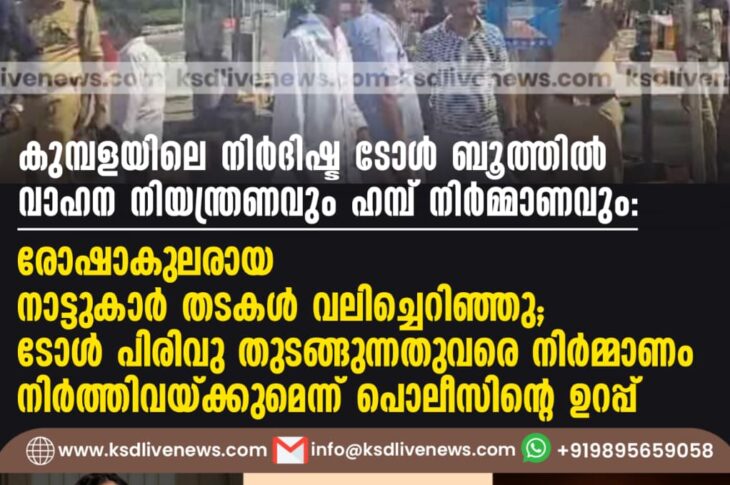 പ്രാദേശികം കുമ്പളയിലെ നിർദിഷ്ട ടോൾ ബൂത്തിൽ വാഹന നിയന്ത്രണവും ഹമ്പ് നിര്മ്മാണവും: രോഷാകുലരായ നാട്ടുകാർ തടകൾ വലിച്ചെറിഞ്ഞു ;ടോൾപിരിവു തുടങ്ങുന്നതുവരെ നിര്മ്മാണം നിർത്തിവയ്ക്കുമെന്ന് പൊലീസിന്റെ ഉറപ്പ്October 20, 2025
